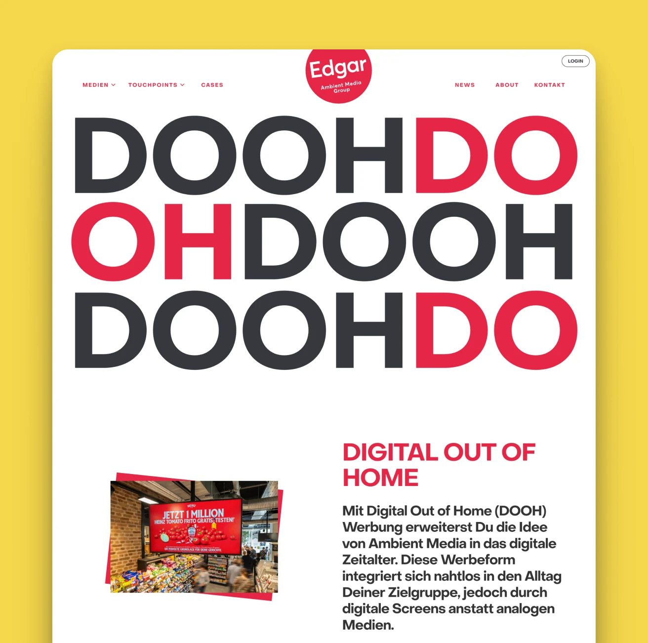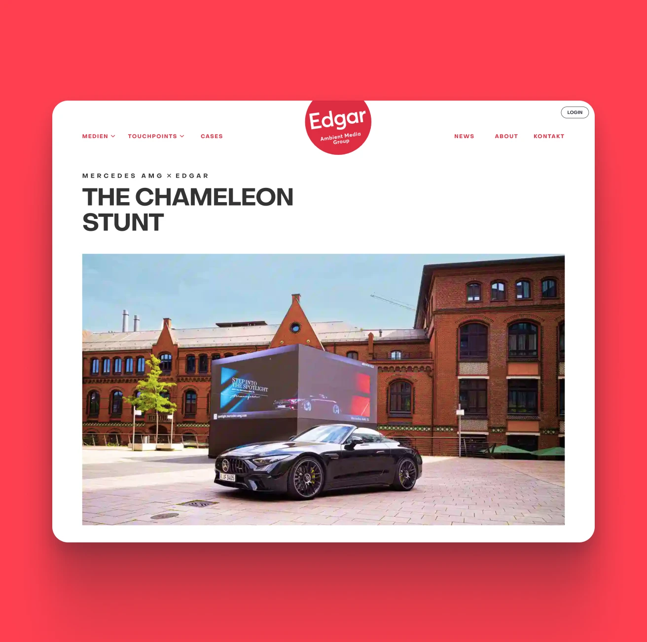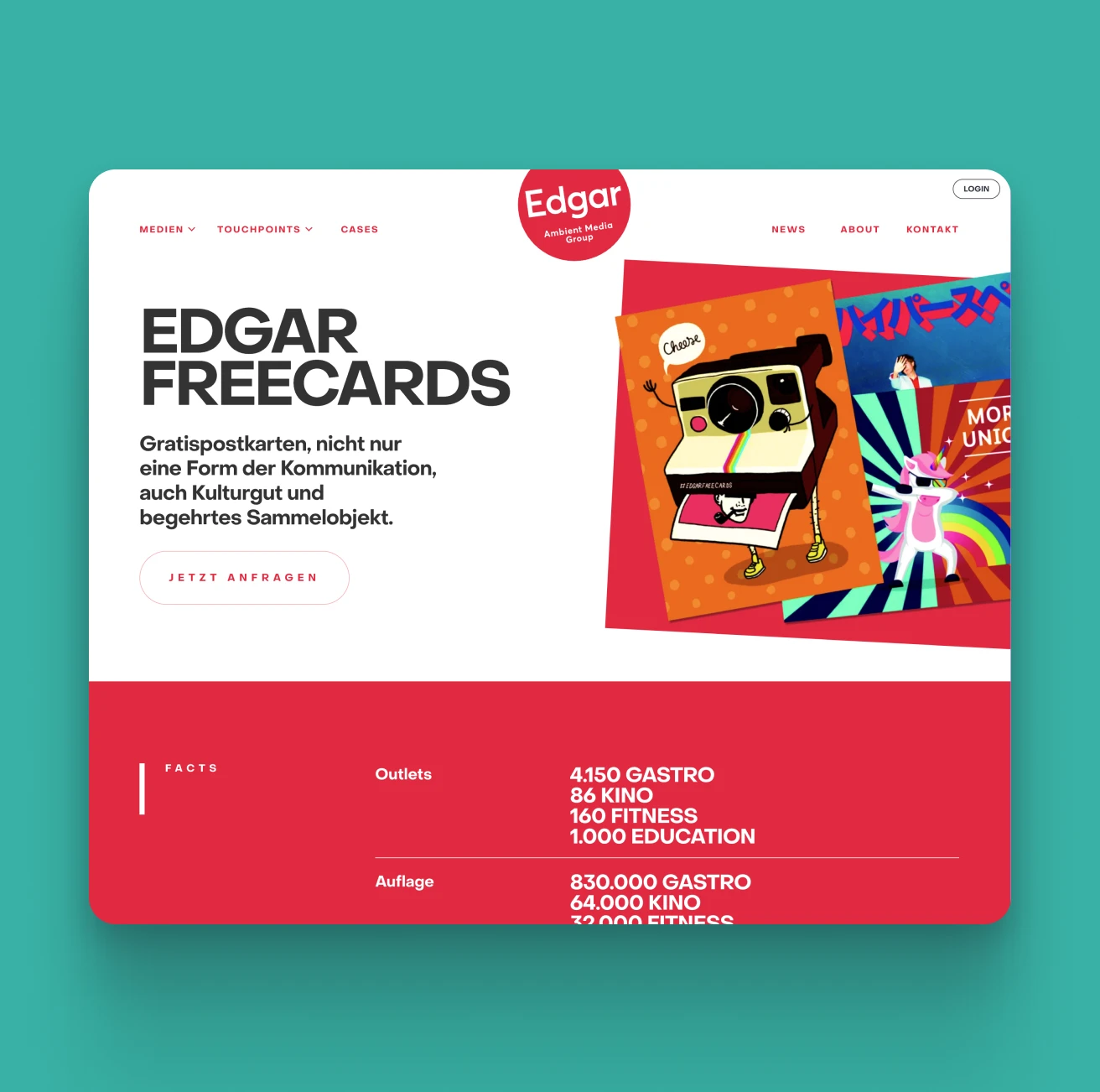 Das Ergebnis ist ein Relaunch, der Edgars Angebot präzise, strukturiert und erlebbar vermittelt. Die neue Seite verbindet Produktinformationen mit klaren Reichweitenargumenten und zeigt die Vielfalt der Touchpoints, an denen Edgar Marken positioniert. Visuell selbstbewusst, inhaltlich klar und mit einer Nutzerführung, die ein komplexes Portfolio zugänglich macht.