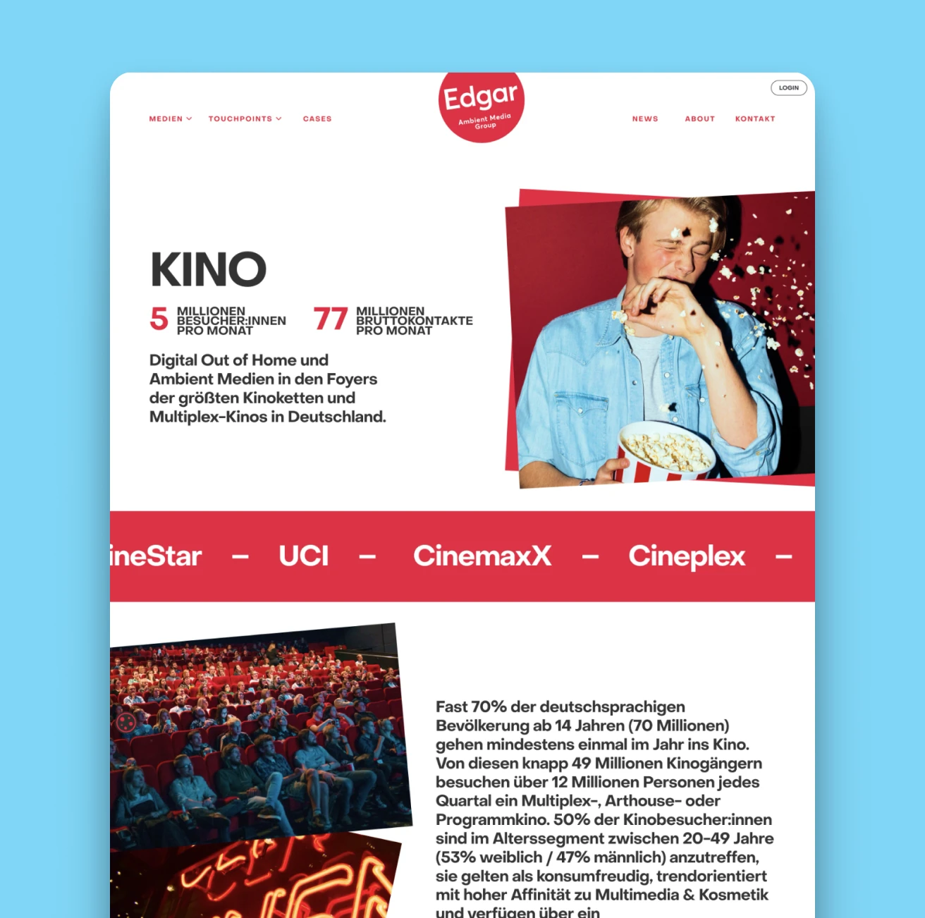 Die Edgar Ambient Media Group stand vor der Herausforderung, dass ihre Website nicht mehr abbildete, was das Unternehmen heute ist: einer der stärksten Anbieter für Ambient Media und DOOH in Deutschland. Die Seite war überholt, komplex und transportierte weder die Markenhaltung noch die enorme Reichweite des Netzwerks. Für ein Unternehmen, das über 60.000 Werbeträger in Gastronomie, Hochschulen, Kinos und Supermärkten betreibt und Zielgruppen präzise in ihrem Alltag erreicht, brauchte es einen digitalen Auftritt, der diese Stärke sichtbar macht.